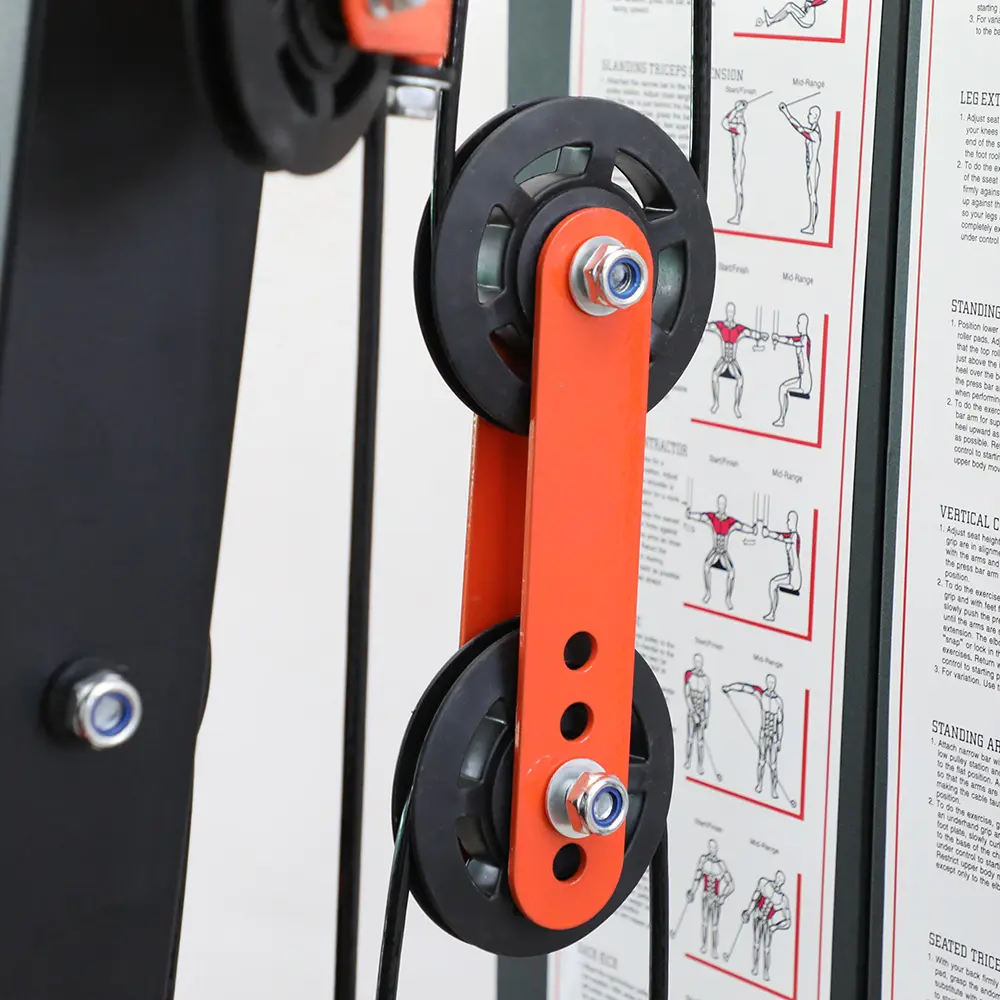 Les fonctions principales de l’appareil comprennent le Lat Pull Down, le Chest Fly, le Biceps Curl, l’Extension Triceps, le Pec-Dec, la Leg Extension, le Leg Curl, et plusieurs autres exercices.